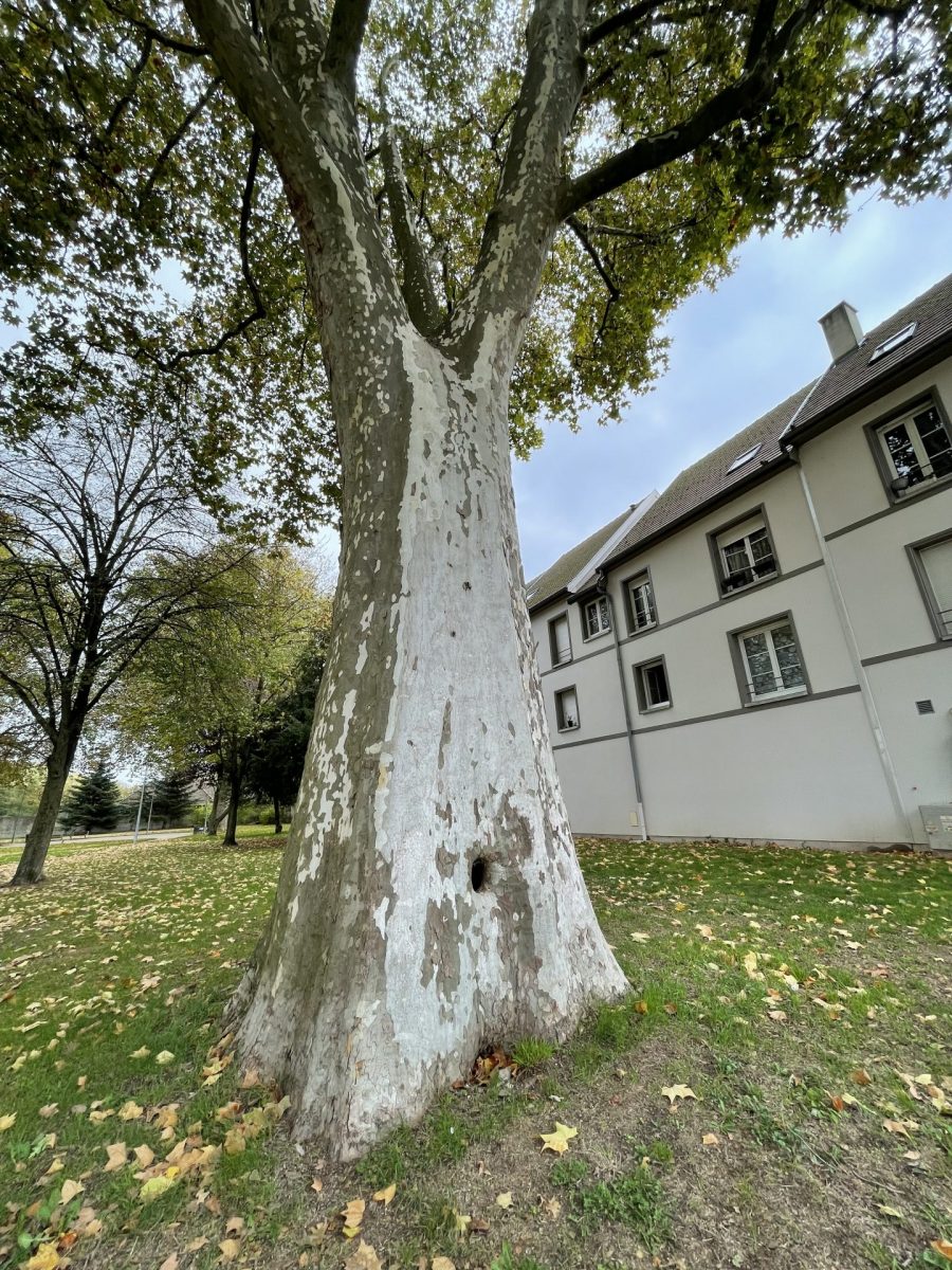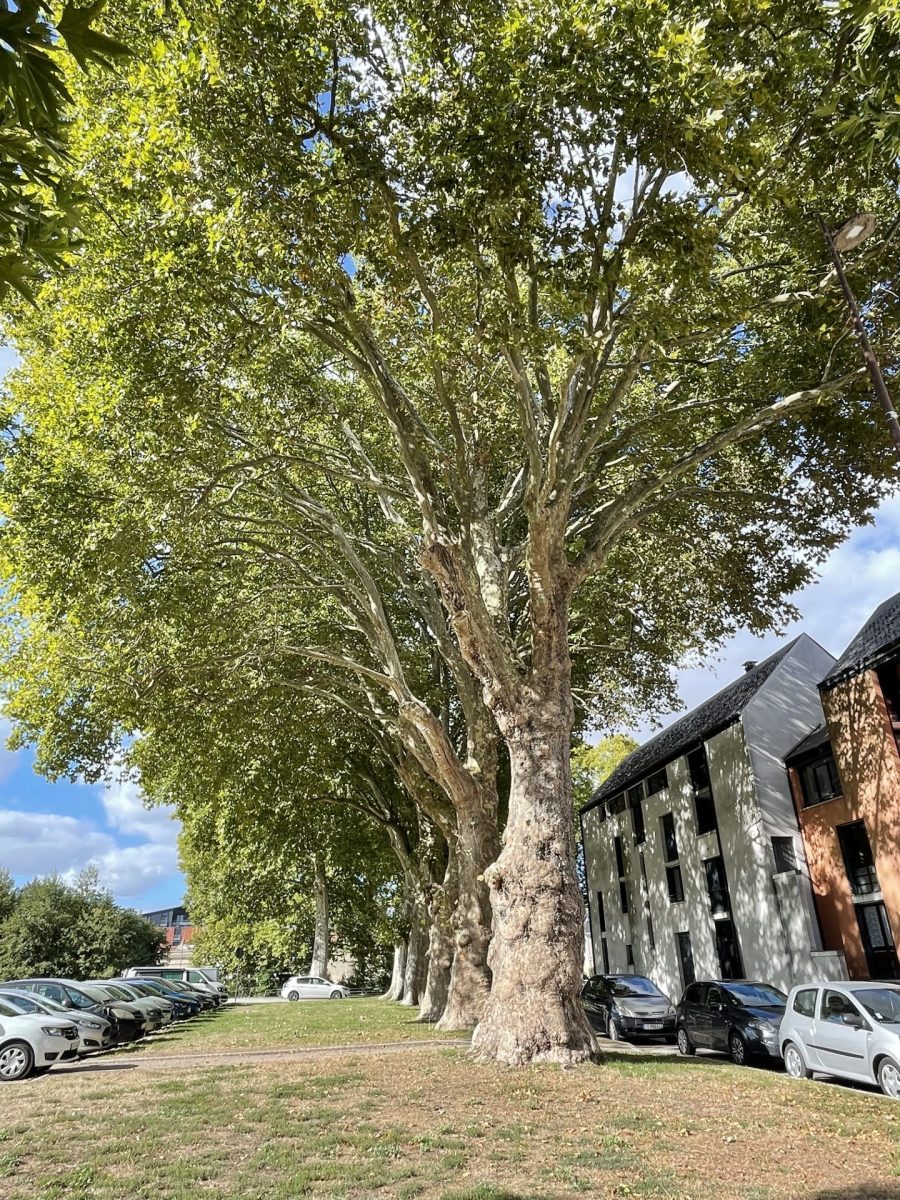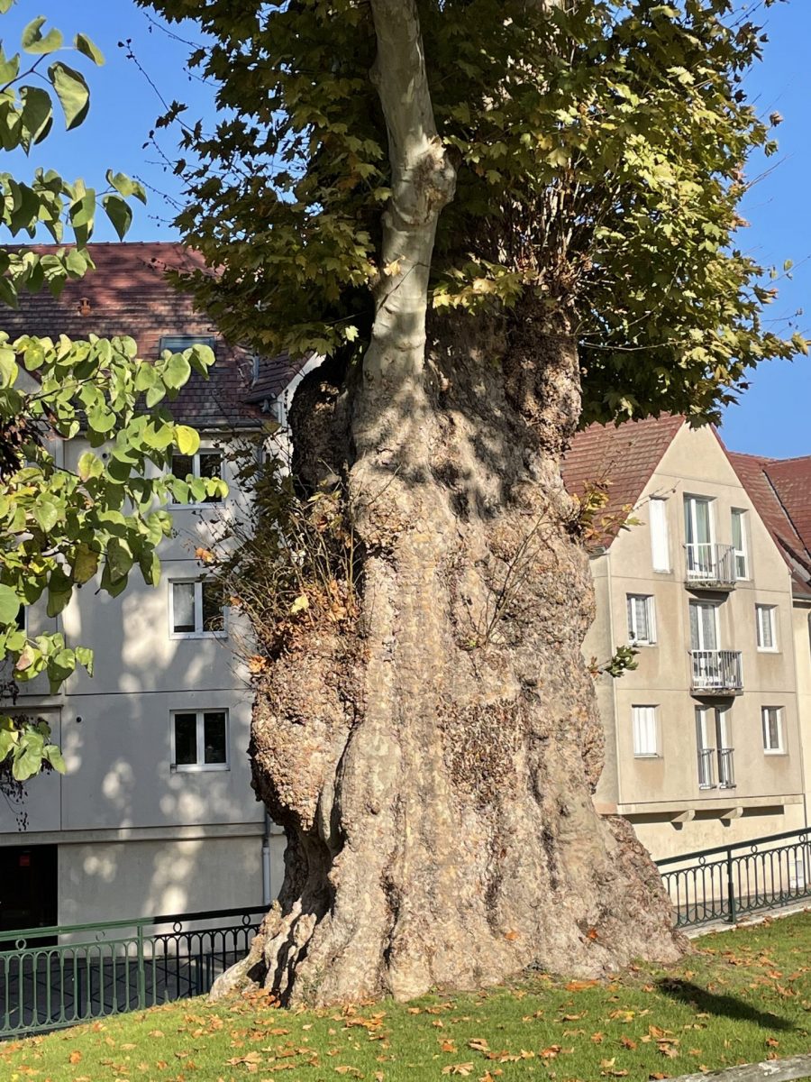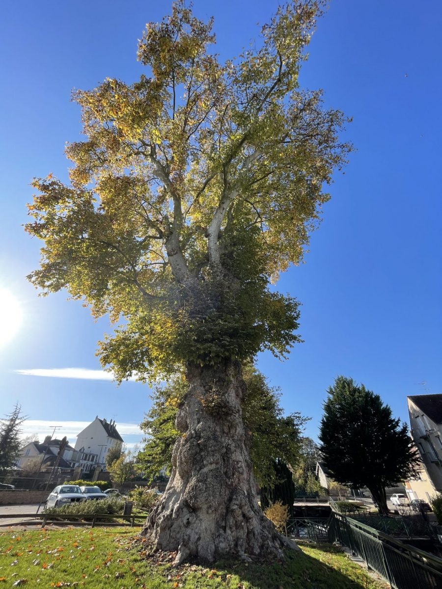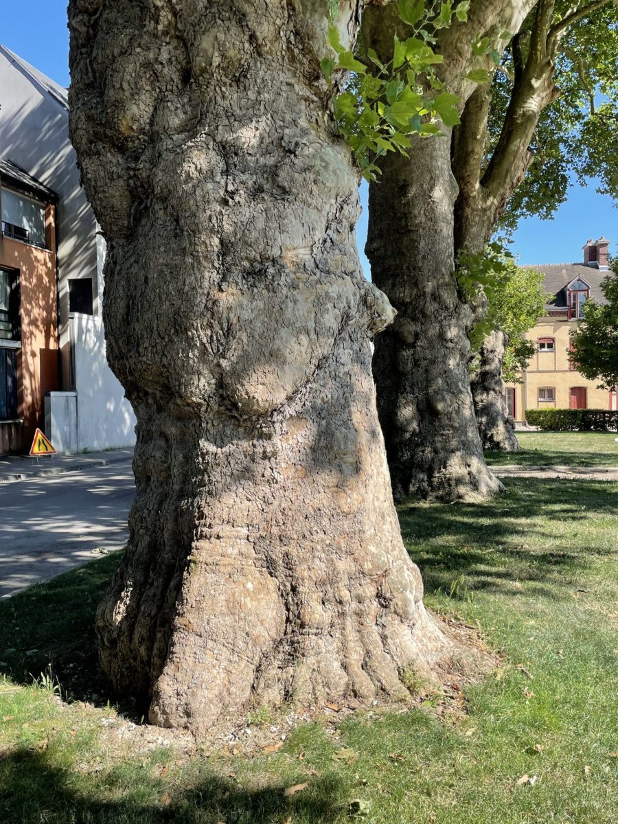Situé au coin du Square de la cité des amis, proche de l’intersection entre la rue Surgale et la Rue Célestin Philbois se trouve un Platane qui impressionne par sa taille et son envergure de 5 mètres 15 mais c’est une tout autre particularité qui doit attirer votre attention.