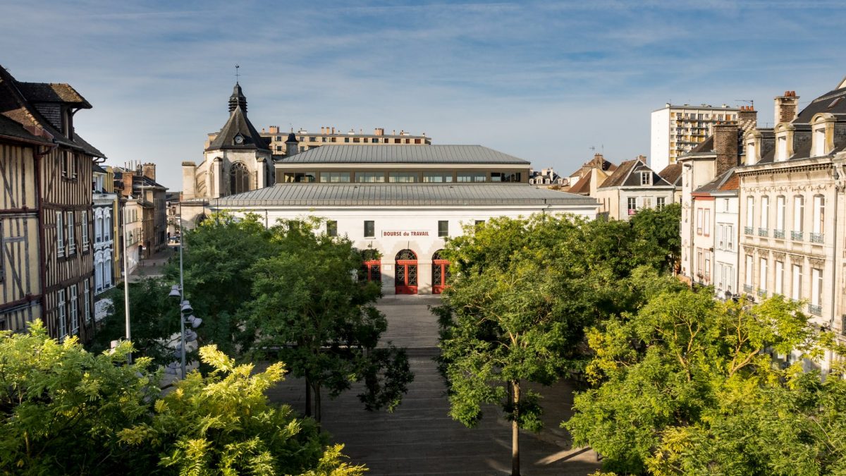 La nouvelle organisation de la société amène également les ouvriers à se structurer en syndicats. C’est ainsi qu’au début du XXe siècle, en 1905, que le bâtiment situé sur l’actuelle place Jean-Jaurès est devenu une bourse du travail. Les ouvriers en recherche d’emploi se rendaient ici, où les usines recrutaient. Ce bâtiment, cependant, est bien plus ancien. Les premières traces que nous avons concernant ce bâtiment, aux alentours du XIIe siècle, nous apprennent qu’il s’agissait d’une halle aux blés. Celle-ci a ensuite été déplacée sur l’actuelle place de la Libération, entre la basilique Saint-Urbain et la préfecture. Le bâtiment de la place Jean-Jaurès est donc devenu un comptoir marchand, où se vendaient des tissus et de nombreuses étoffes.