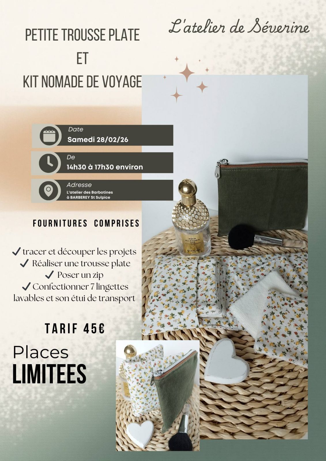 Séverine vous propose un nouvel atelier couture autour de la confection d'une petite trousse plate et d'un kit nomade de voyage