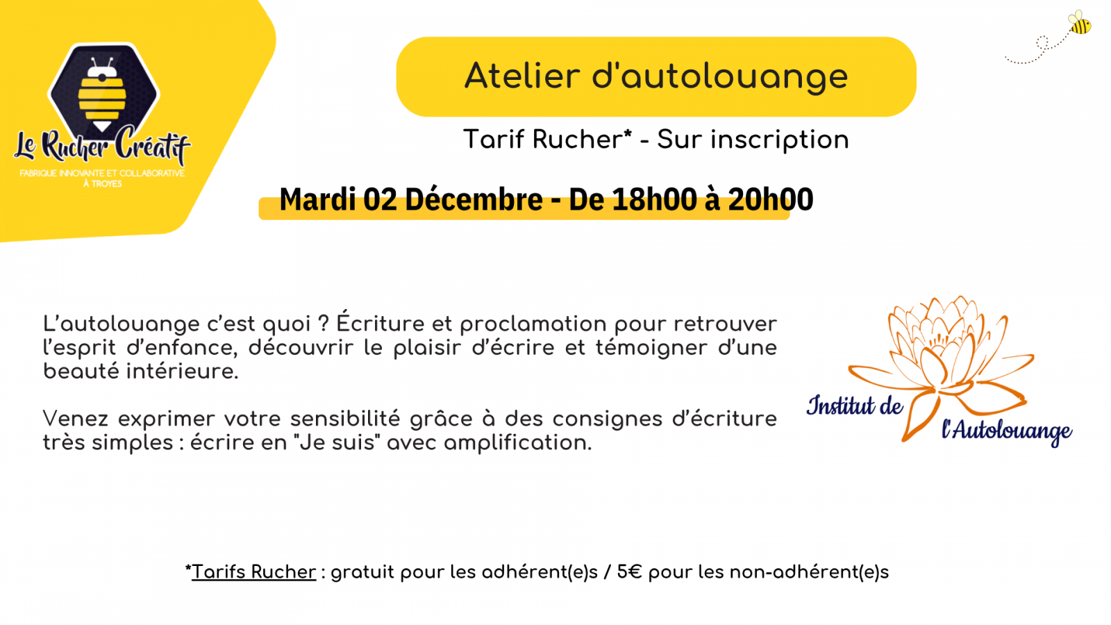 Pratiquer l’autolouange, un moment unique pour booster la confiance en soi et en l’autre, en révélant le poète qui sommeille en chacun. Animé par notre adhérente et administratrice, Anne-France.