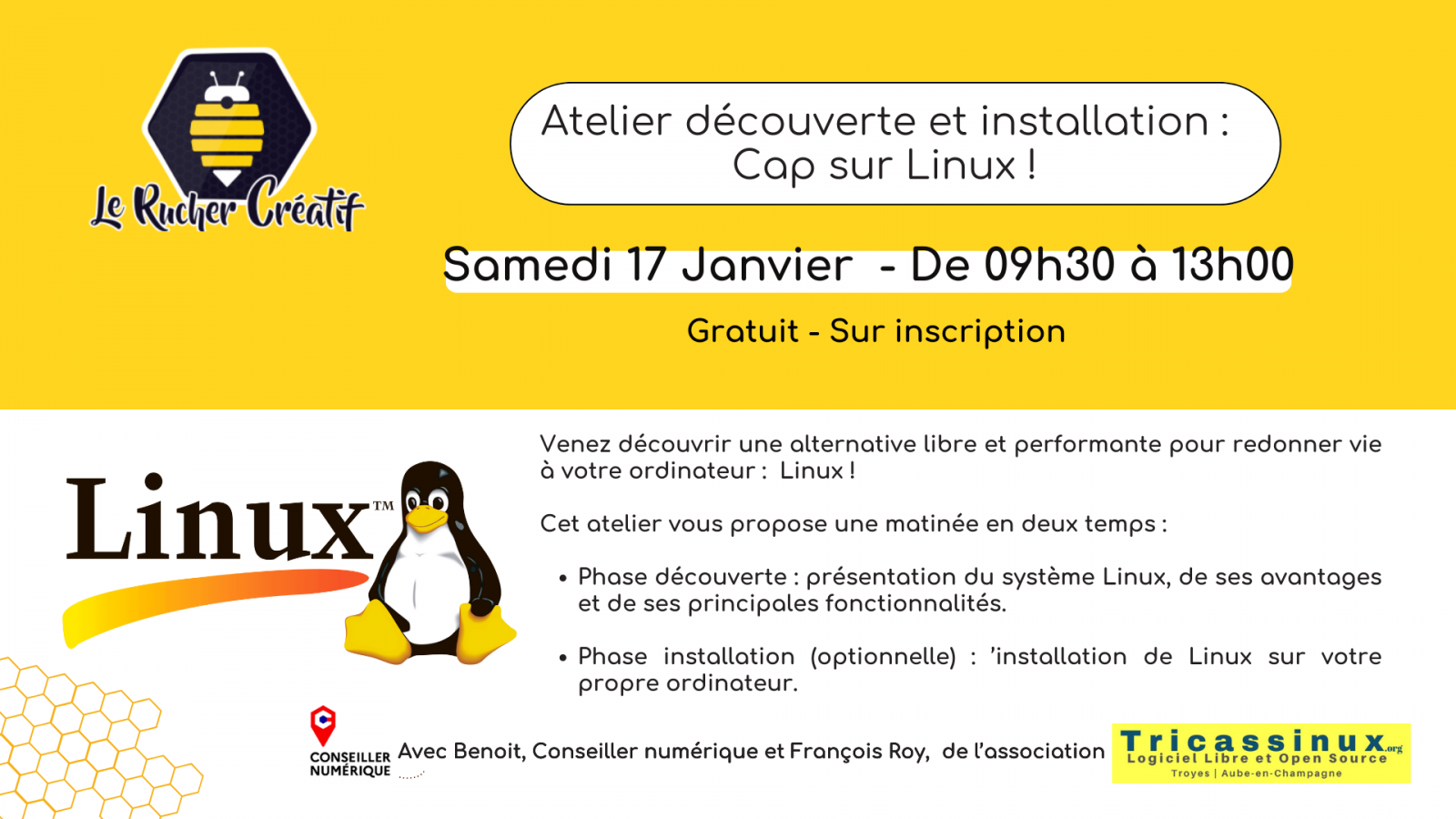 Accompagné de Benoît, notre conseiller numérique, et en partenariat avec l’association Tricassinux, cet atelier vous propose une matinée en deux temps :