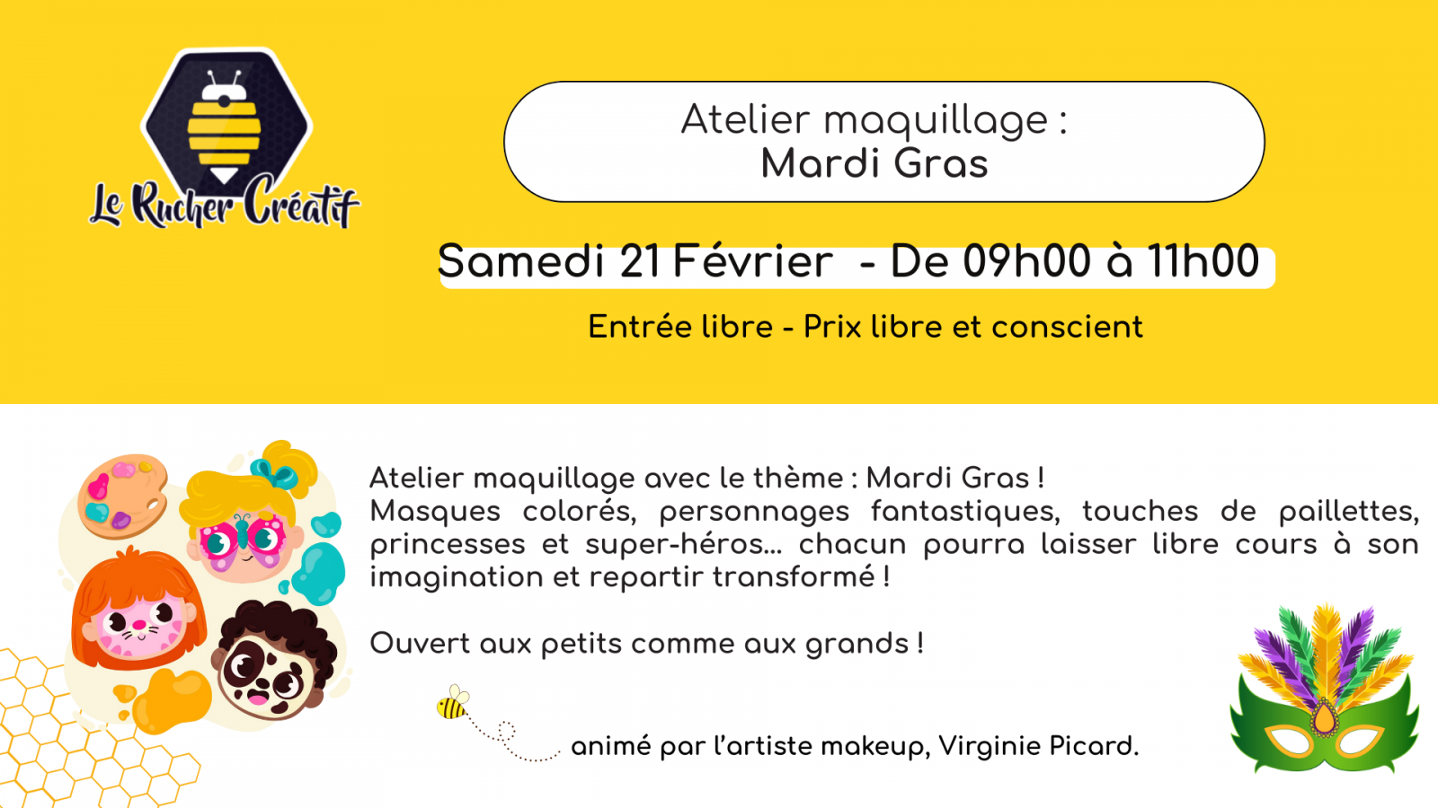 L’artiste makeup Virginie Picard proposera des maquillages festifs et créatifs pour célébrer Mardi Gras dans une ambiance conviviale et joyeuse : Masques colorés, personnages fantastiques, touches de paillettes, princesses et super-héros… chacun pourra laisser libre cours à son imagination et repartir transformé !