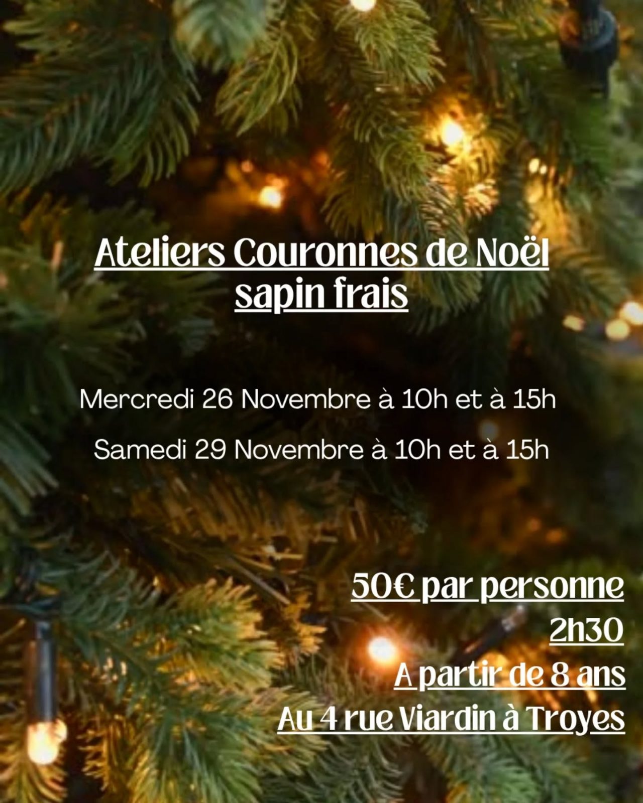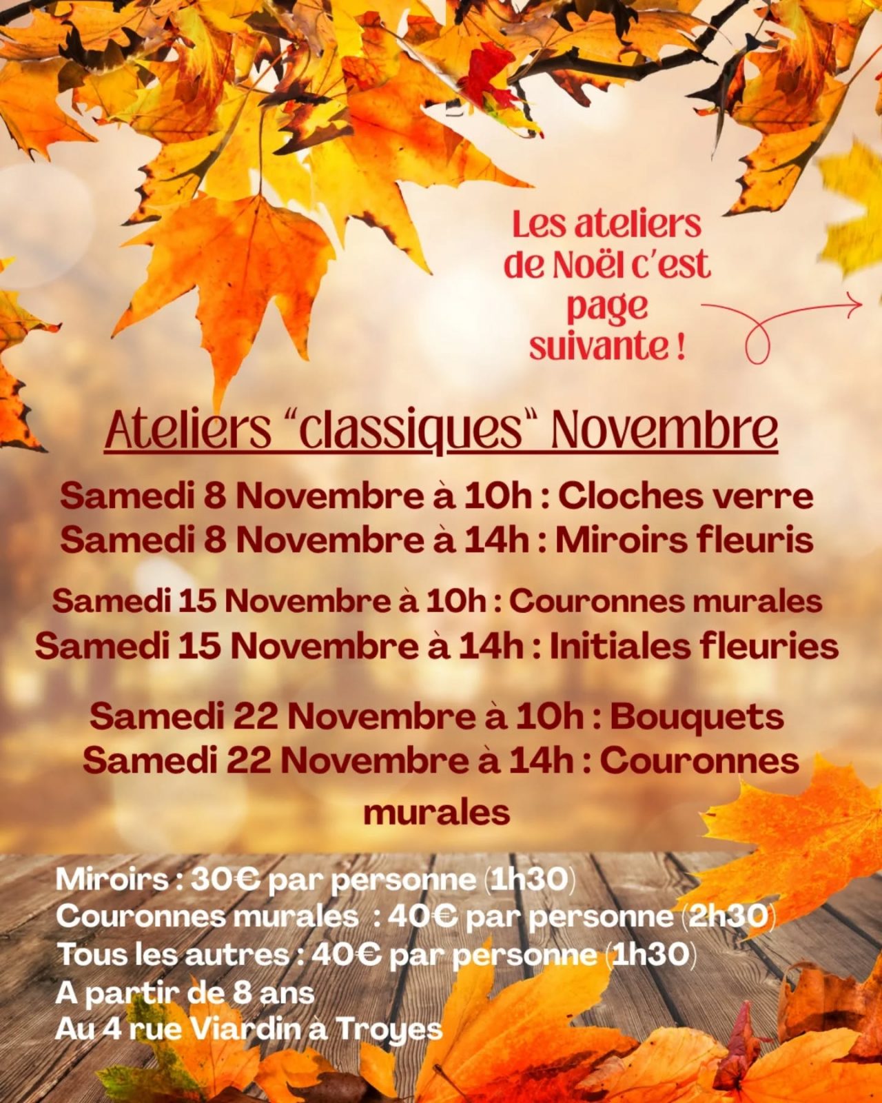 | Tarif unique Miroirs fleuris : 30€/pers. Cloches, couronnes, bouquets et initiales : 40€/pers. Couronnes de noël sapin frais : 50€/pers. | Min : 30€ | Max : 50€ |