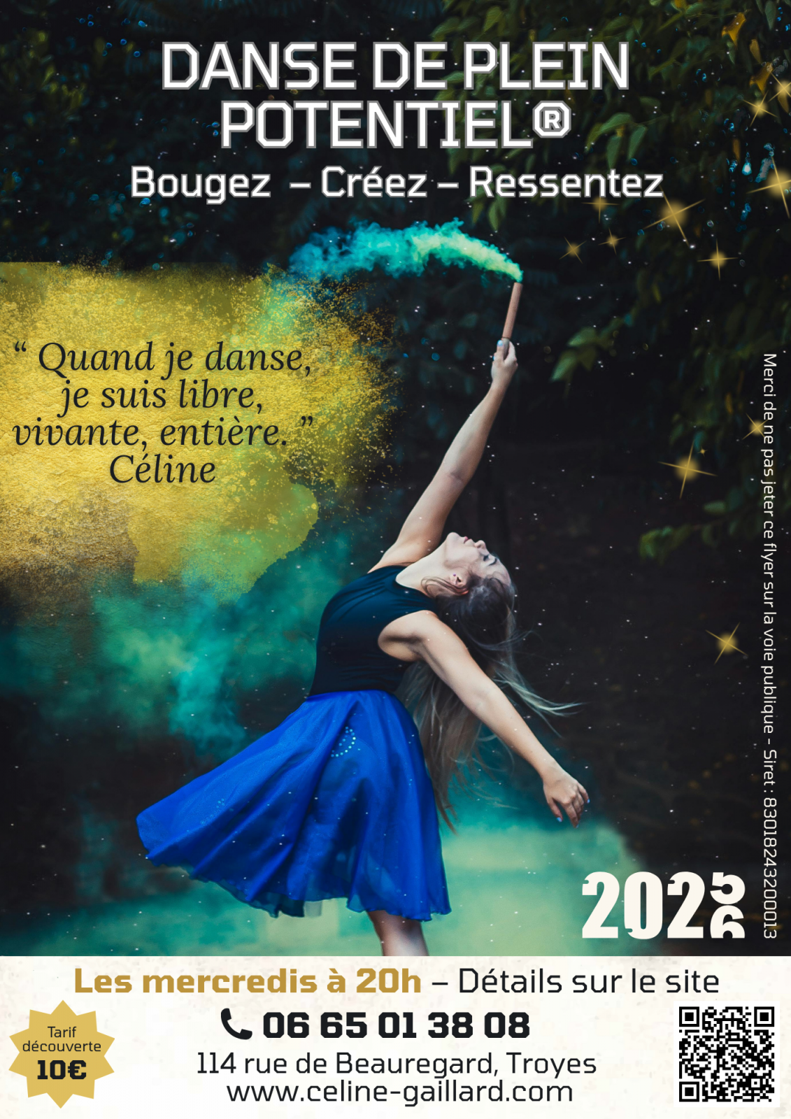 Danse de Plein Potentiel® à Troyes : Un voyage sensoriel et expressif à travers la danse. Cette approche reconnue par l'UNESCO invite à explorer le corps et la créativité de façon instinctive, pour révéler les ressources naturelles que chacun porte en lui. Les ateliers offrent un espace d'exploration personnelle, où le corps devient le guide de l'expression, favorisant une reconnexion à soi, à sa créativité naturelle et à son bien-être global. Chaque séance inclut un temps de mouvement libre en musique, suivi d'une expression créative (dessin, écriture, etc.) pour exprimer les ressentis.
