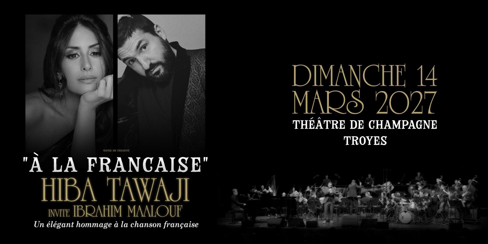 Avec "À la française", Hiba Tawaji rend hommage à l’héritage de la chanson française à travers un programme inédit, intime et élégant. Sur scène, elle invite son époux, le trompettiste virtuose Ibrahim Maalouf, pour un hommage vibrant et audacieux à ce répertoire qui traverse les générations.