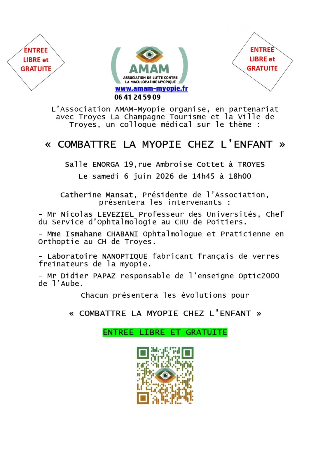 L’Association AMAM-Myopie organise, en partenariat avec Troyes La Champagne Tourisme et la Ville de Troyes, un colloque médical sur le thème : « COMBATTRE LA MYOPIE CHEZ L’ENFANT »