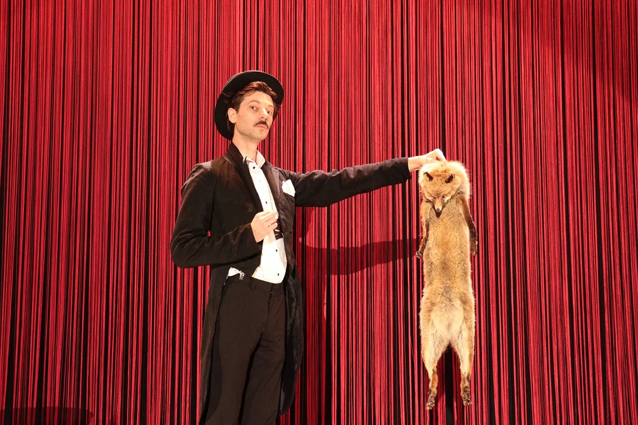 Référence incontournable de la magie nouvelle, Étienne Saglio signe ici un petit bijou d’invention et de drôlerie. Les visions de ce goupil qui s’envole, accroché à la ficelle d’un ballon rose, qui se met à danser sur la table ou chipe les lunettes de son partenaire de scène, ont de quoi fasciner petits et grands.
