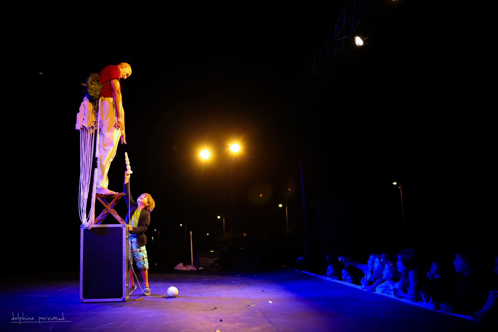 Le spectacle est parti sur des bases très sérieuses, le public ne bronche pas, retenant son souffle comme le jongleur lui-même. Il devient clown, perché sur une valise, en équilibre instable, afin de pouvoir utiliser un bilboquet dont la corde est trop longue. Moment de fou rire puis de candeur quand un jeune enfant, particulièrement bon joueur, vient l’aider dans son absurde attitude…