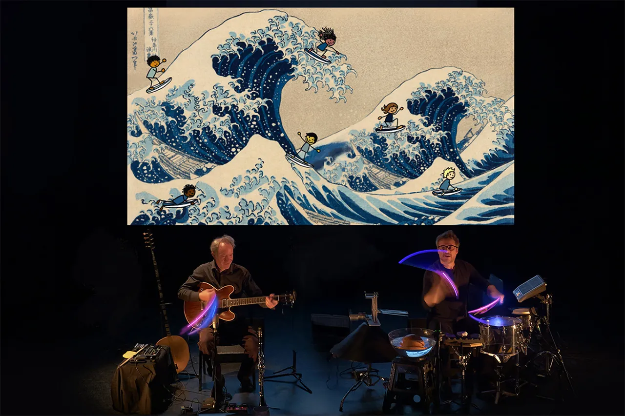 Racontée à hauteur d’enfants cette histoire nous plonge dans le rouge ocre des peintures rupestres ou celui de Raoul Dufy, le bleu de l’estampe japonaise d’Hokusai ou celui de Geneviève Asse, le violet de Claude Monet, les motifs « aborigènes » d’Australie, la malice du Street Art ou le clair-obscur de Rembrandt, au gré d’un film magnifique mêlant vidéo et animation graphique. Les musiciens sur scène avec leur instrumentarium incroyable - associant guitare électrique, luth oriental, clarinette et percussion d’eau, de cailloux, de tiges de verres ou encore de feuilles de papier - nous emmènent dans un monde de couleurs sonores hypnotiques et virtuoses.