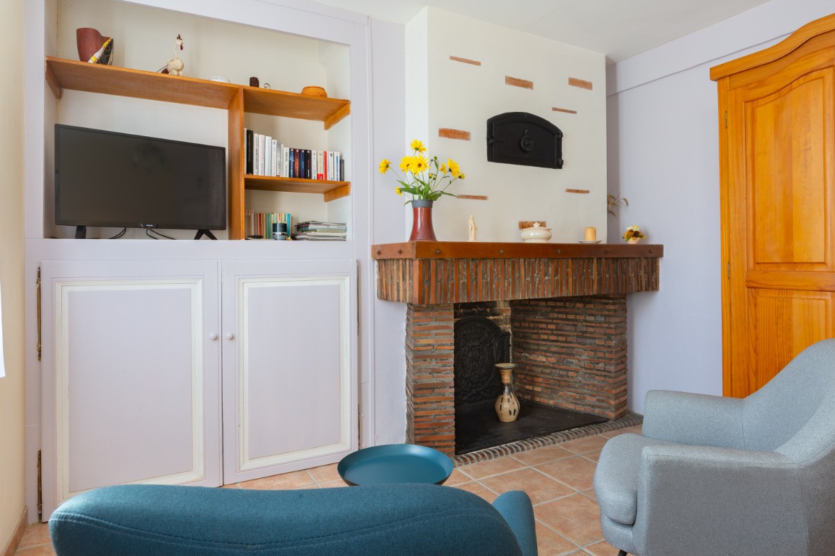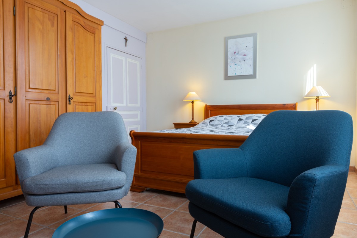 > Chambre avec lit double (2 personnes) : fauteuil, grand téléviseur, jeux de société et livres
