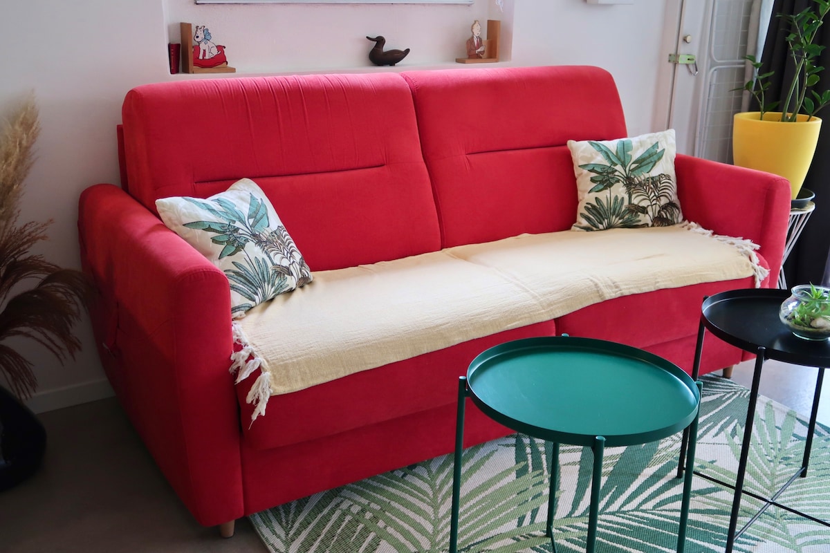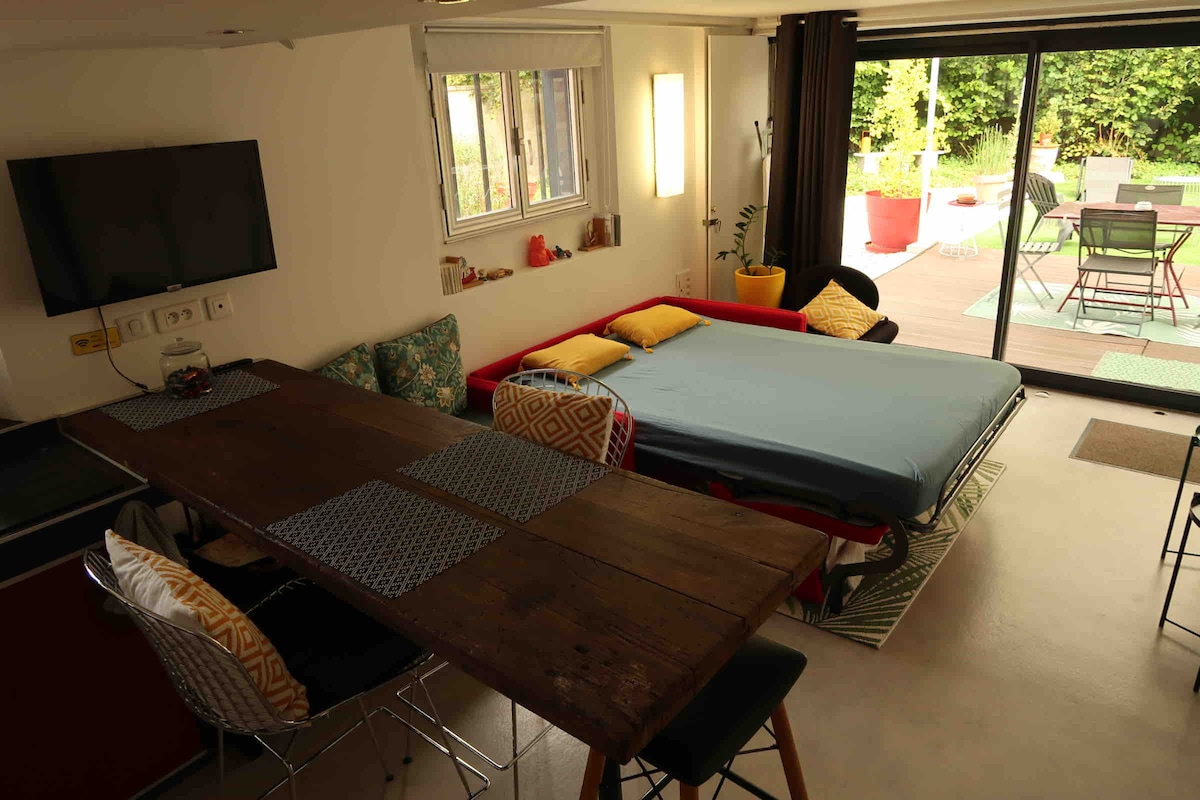Lit King size avec draps et télé 40 pouces, une salle de bain (serviettes fournies) avec wc, cuisine ouverte sur un salon avec un canapé convertible (1,60m) de bonne qualité à mémoire de forme.