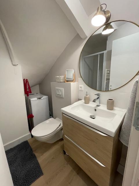 Pour votre confort, le logement est équipée d'une salle d'eau avec vasque, douche, sèche-serviettes et lave-linge.