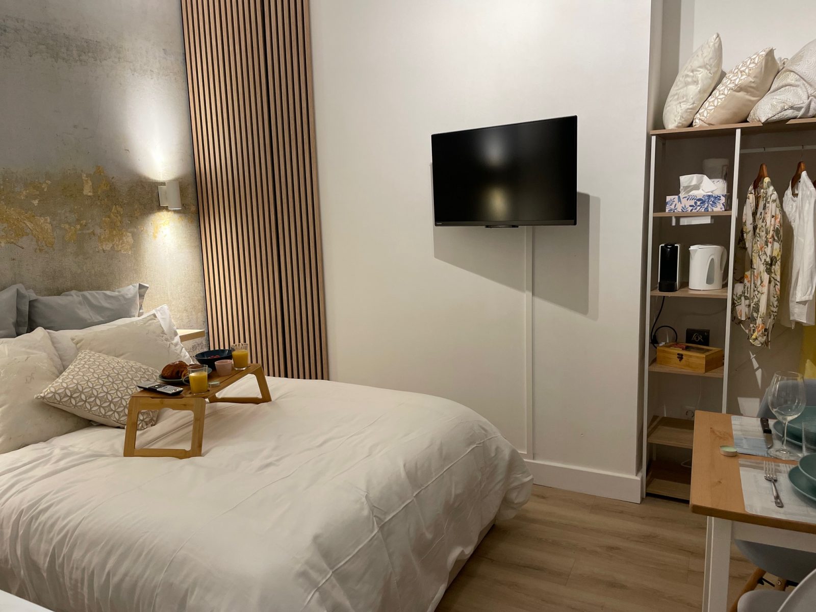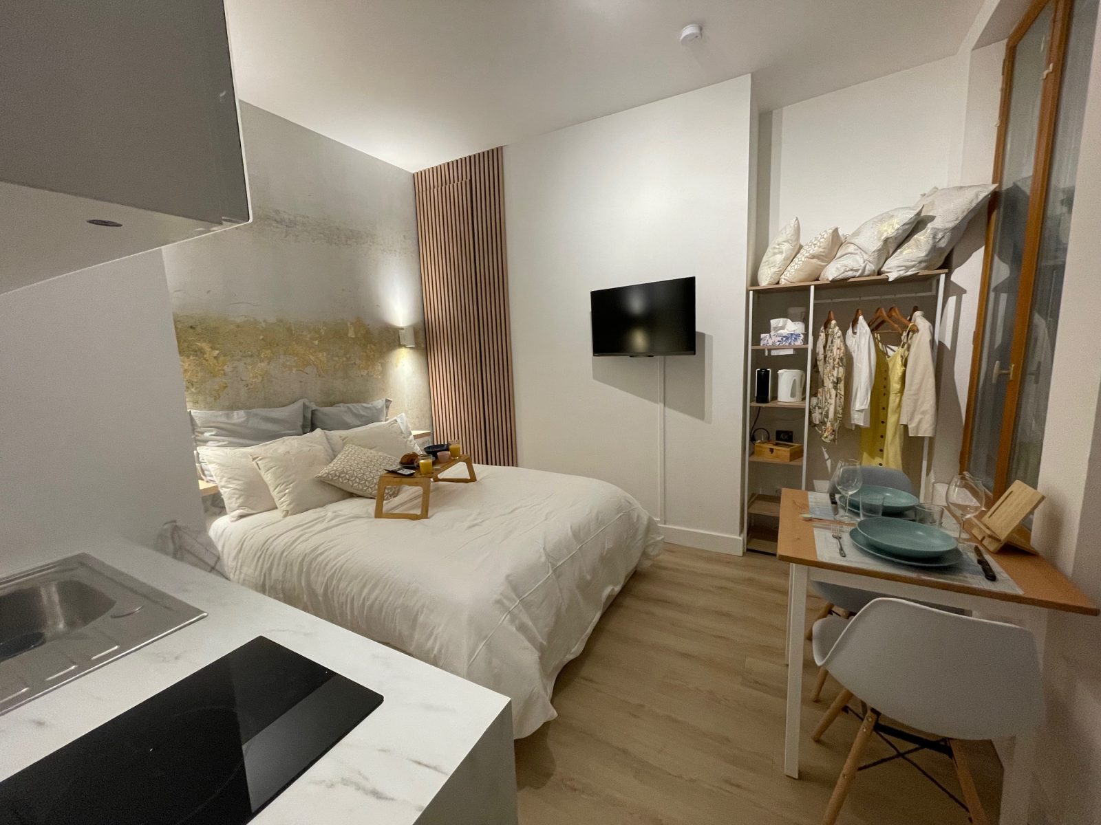 Le studio est situé dans un immeuble typique de l'architecture locale et vous serez charmé par le patrimoine troyen. Les fenêtres donnent sur la cour intérieure de l'immeuble. Vous dormirez dans un lit deux places confortable, avec télévision, Molotov TV et internet en wifi. Vous pourrez préparer vos repas dans l'élégant coin cuisine et vous restaurer sur la table.