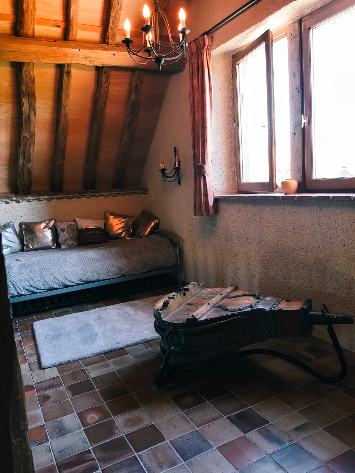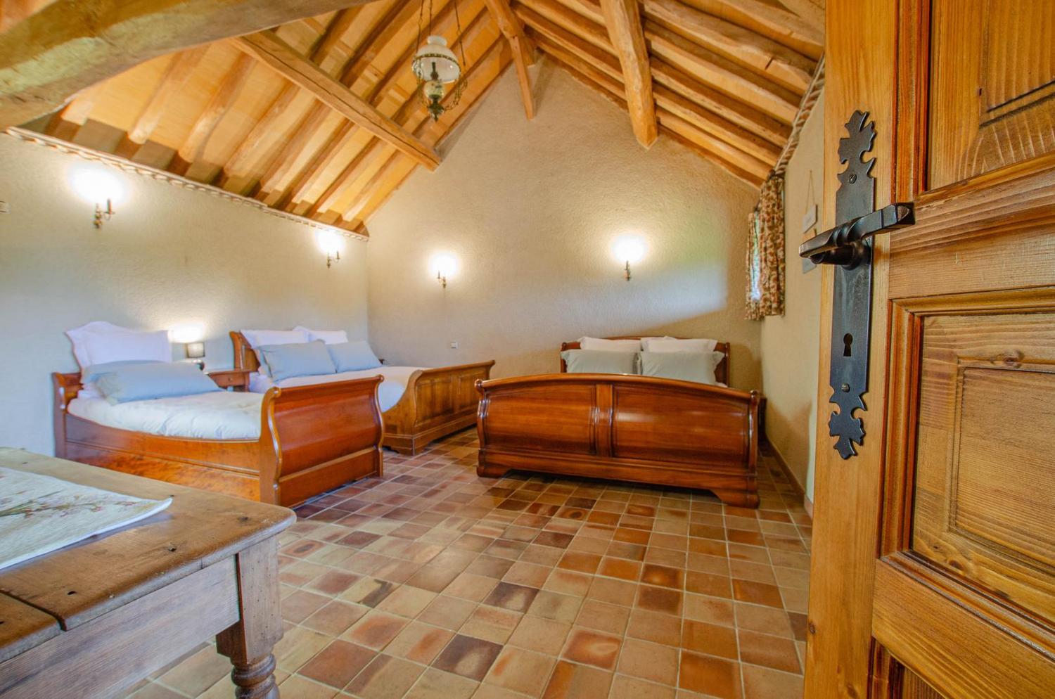 À l’étage, se trouvent une chambre triple (lit 140×190 + lit 90×190), une chambre twin (2 lits 90×190) et une chambre familiale (lit 140×200, lit 160×200 et lit 90×190) équipée d’une télévision. Vous bénéficierez également d’une mezzanine aménagée en salon détente avec canapé et TV, d’un coin jeux pour les enfants, d’une salle de bain (baignoire + double vasque) et de WC indépendants avec lave-mains.