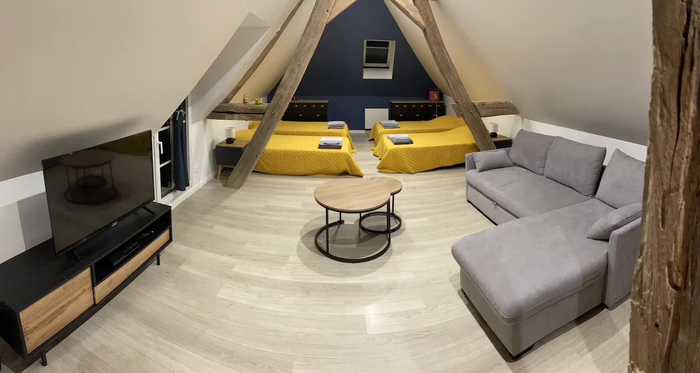 L'étage est composé de 3 chambres pour un total de 10 personnes, idéale pour grande famille ou 2 couples avec enfants. Chambre 1 : 1 lit double + 1 lit simple, Chambre 2 : 1 lit double + 1 lit simple, Chambre 3 : 4 lits simples + salle de jeux et TV.