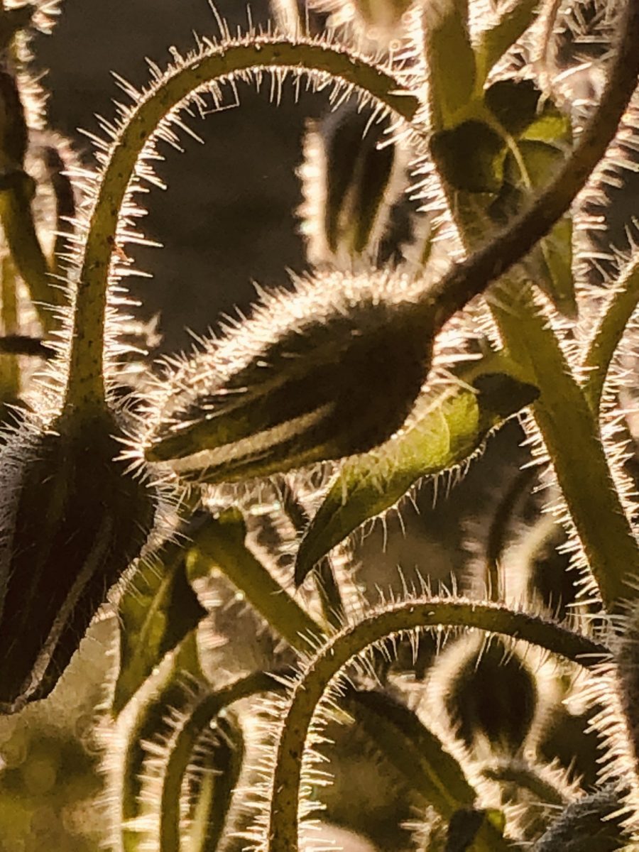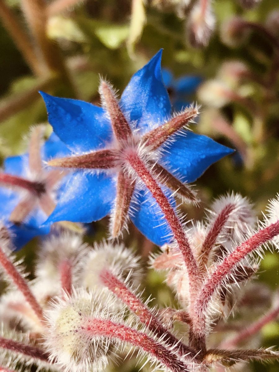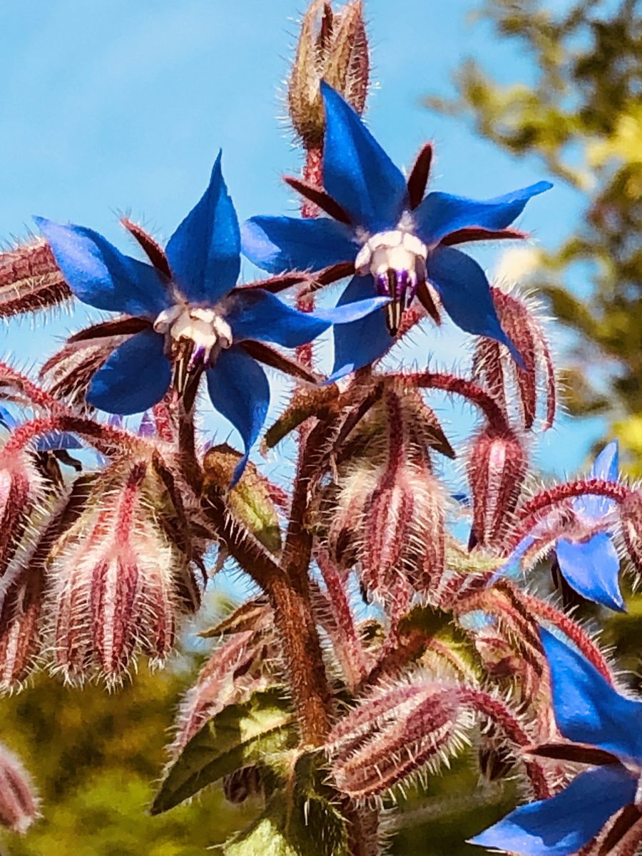 Aussi, éclairés de ces mots, arrêtons-nous la tête penchée sur celles modestement inclinées des bourraches, aux fleurs célestes regroupées en cymes.