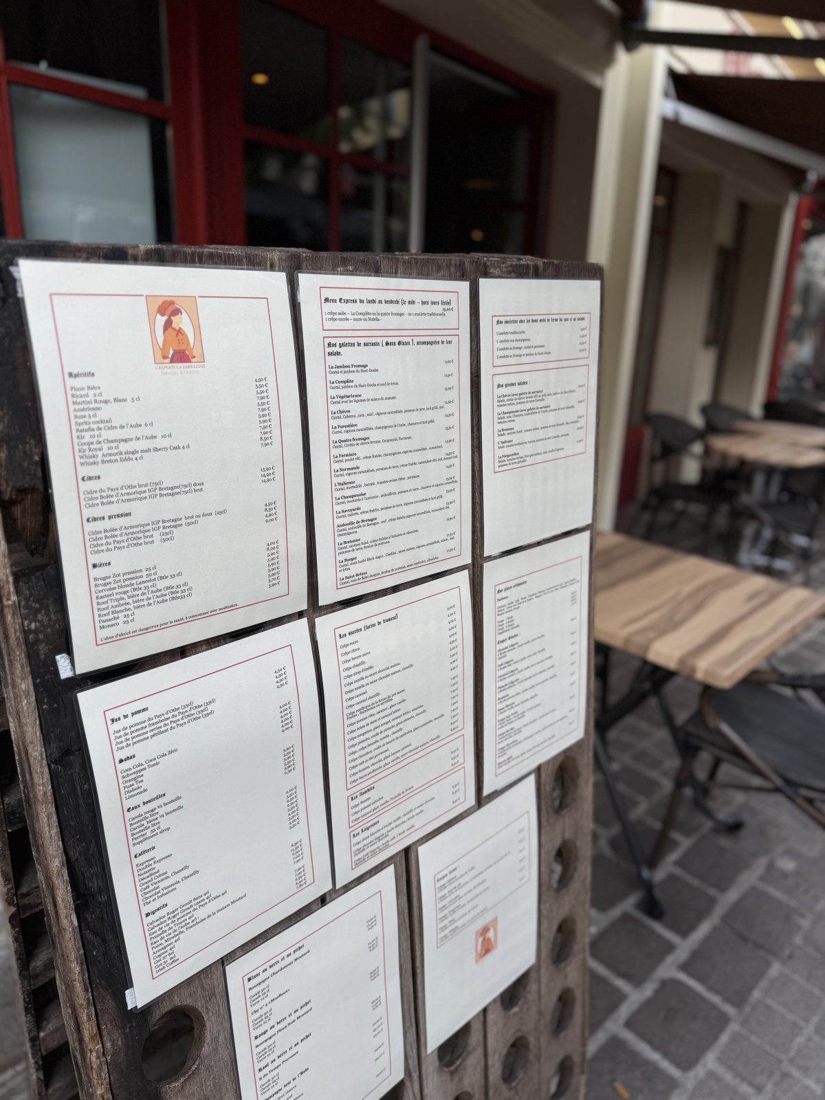 | Menu du jour une crêpe salée ou omelette accompagnée d'une salade + une crêpe sucrée + un café | Min : 15€ | Max : 15€ |