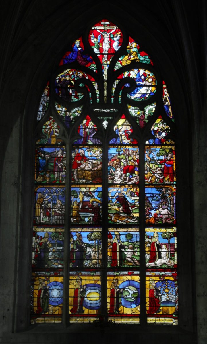 Les vitraux de l’église Sainte-Madeleine sont de véritables trésors. Entrez, puis remontez le bas-côté sud et dirigez-vous vers le chevet de l’église. Là, juste devant vous, regardez ce chef-d’œuvre du 16e siècle : ce vitrail raconte avec finesse, la Création du monde. Prenez le temps de l’observer… chaque scène est une page d’un récit universel.