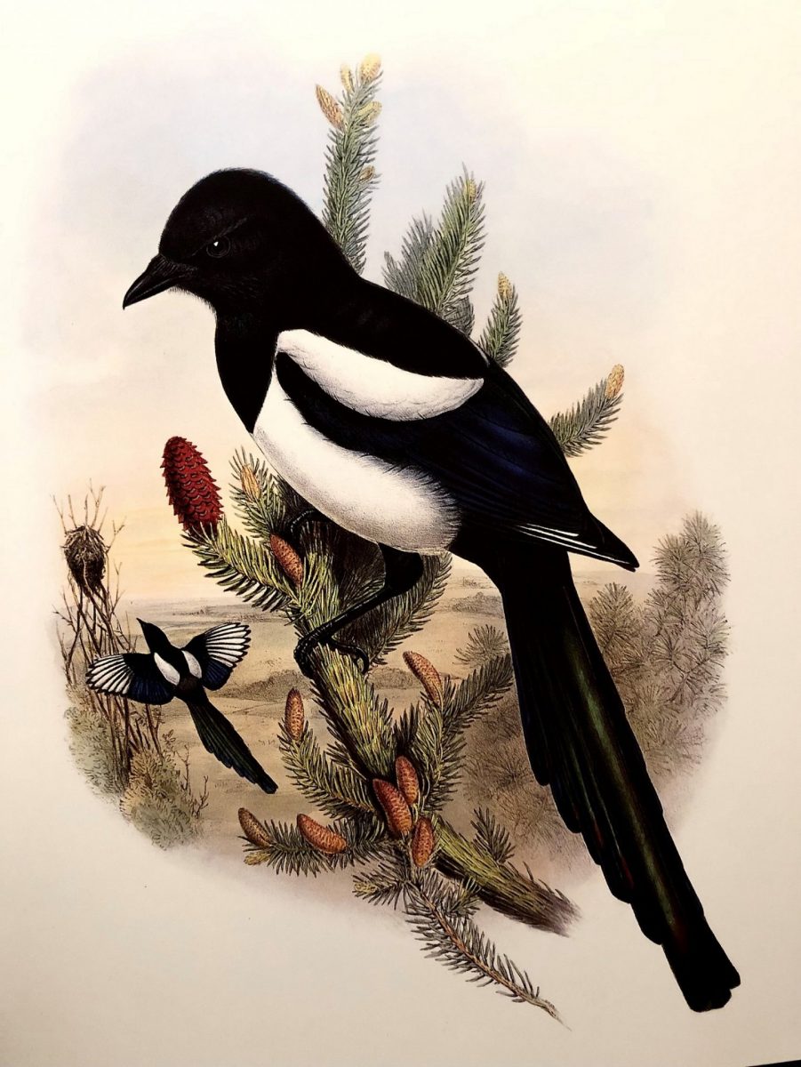 Épiant éperdument le pays de son perchoir de pie, une innée prudence alliée à une vue perçante agréent à la pie pour discriminer le profil d’un promeneur et d’un chasseur errant.