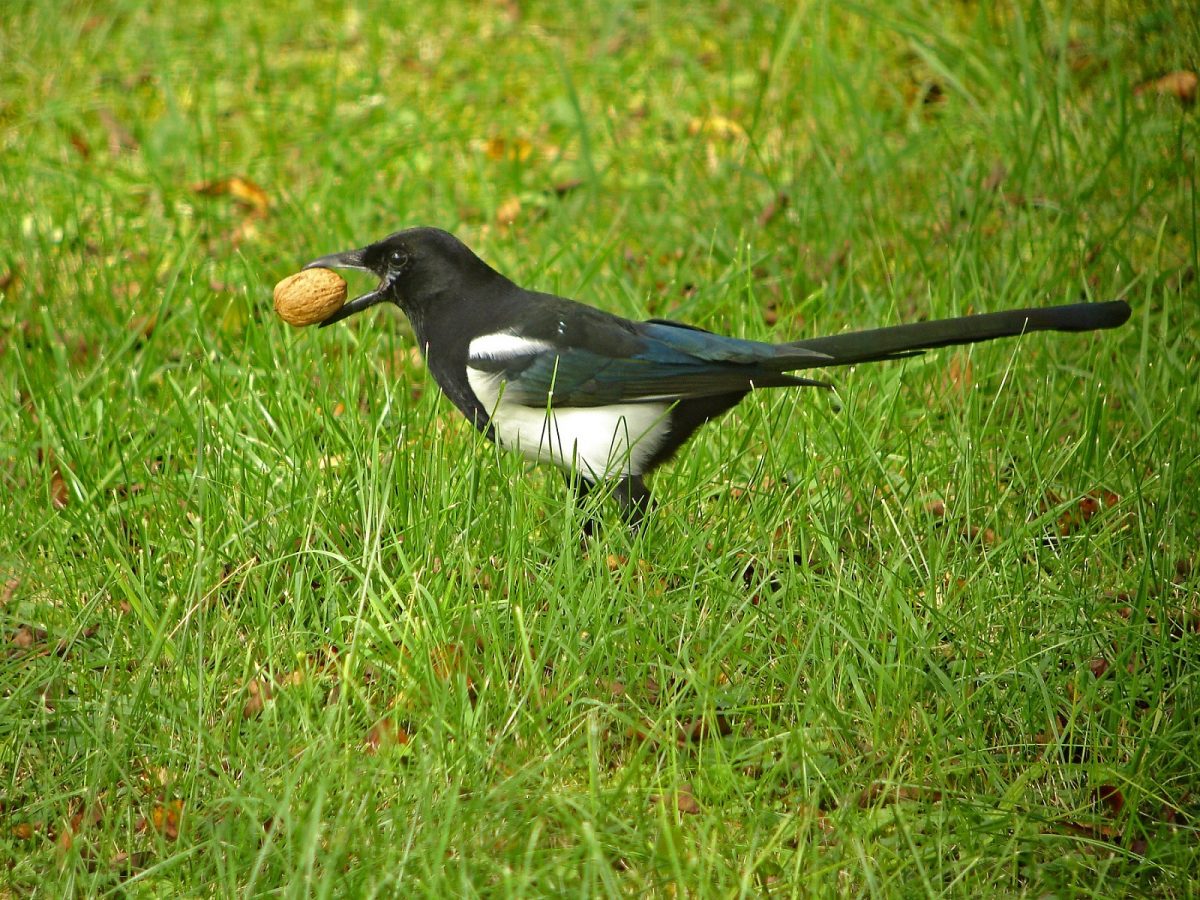 La pie se saisit d’une noix pour la porter dans son nid et la fractionner © Fabrice Croset