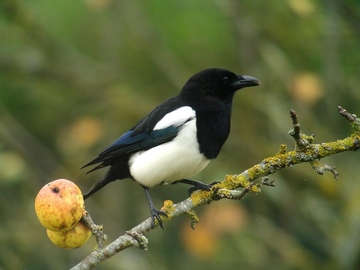 C’est la pie bavarde ( pica pica, en latin ) ou agace, à la forte personnalité, au bec puissant, à l’œil dur, costumée de pantalons noirs bouffants.
